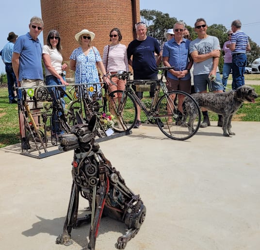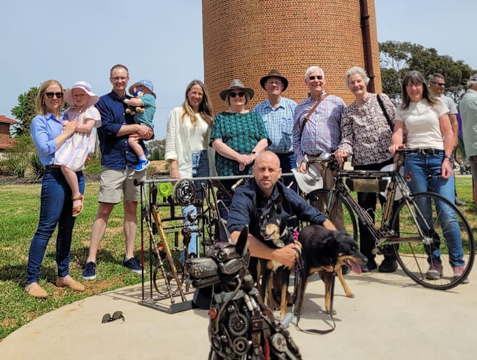 A metal sculpture of a beloved dog patiently waiting for her owner to return and a bicycle rack both including Holden parts has been created in memory of Rutherglen farmer and cyclist Tony Reeckman.